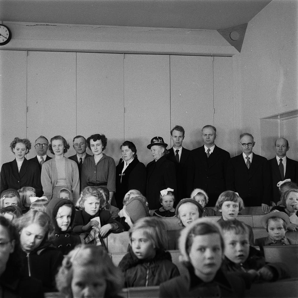 Fullur salur af börnum með fullorðnu fólki standandi aftast.
