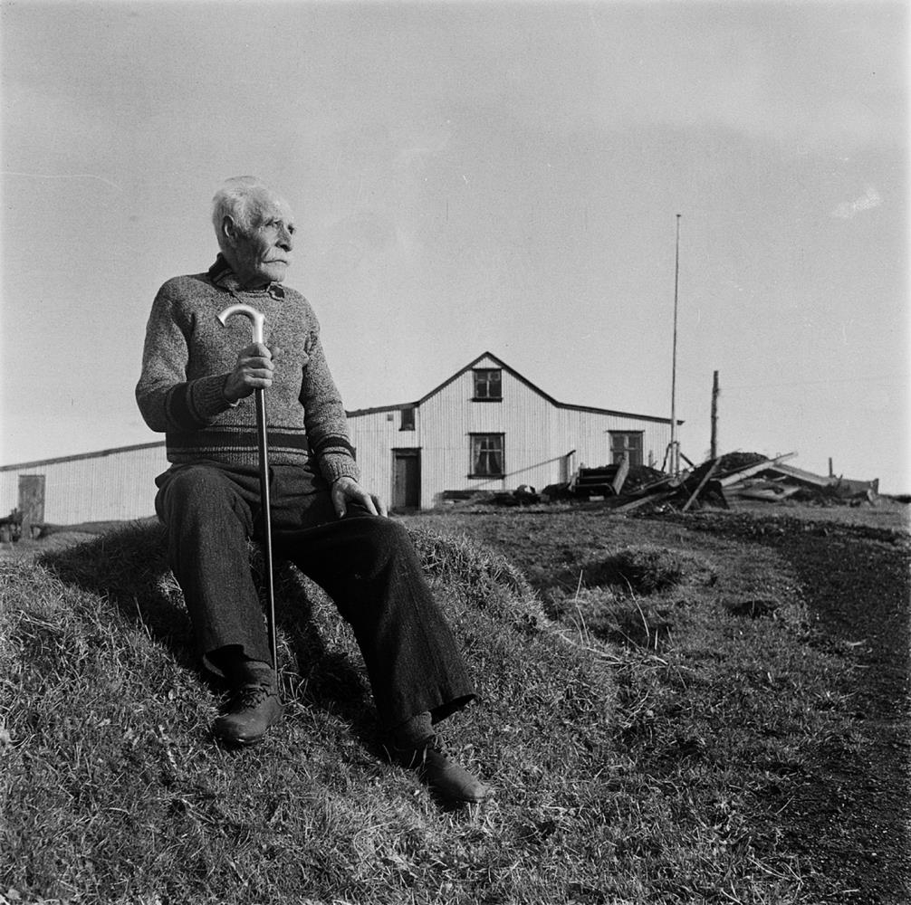 Maður í prjónaðri peysu situr á barði með staf í hendi. Íbúðarhús í baksýn. Eggert Norðdahl bóndi (f. 18.7.1866).