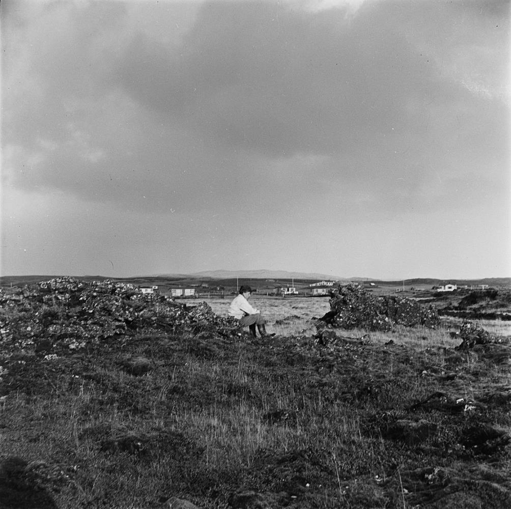 Maður situr í hraunjaðri. Fjær má sjá röð sumarhúsa. Karl Norðdahl bóndi.
