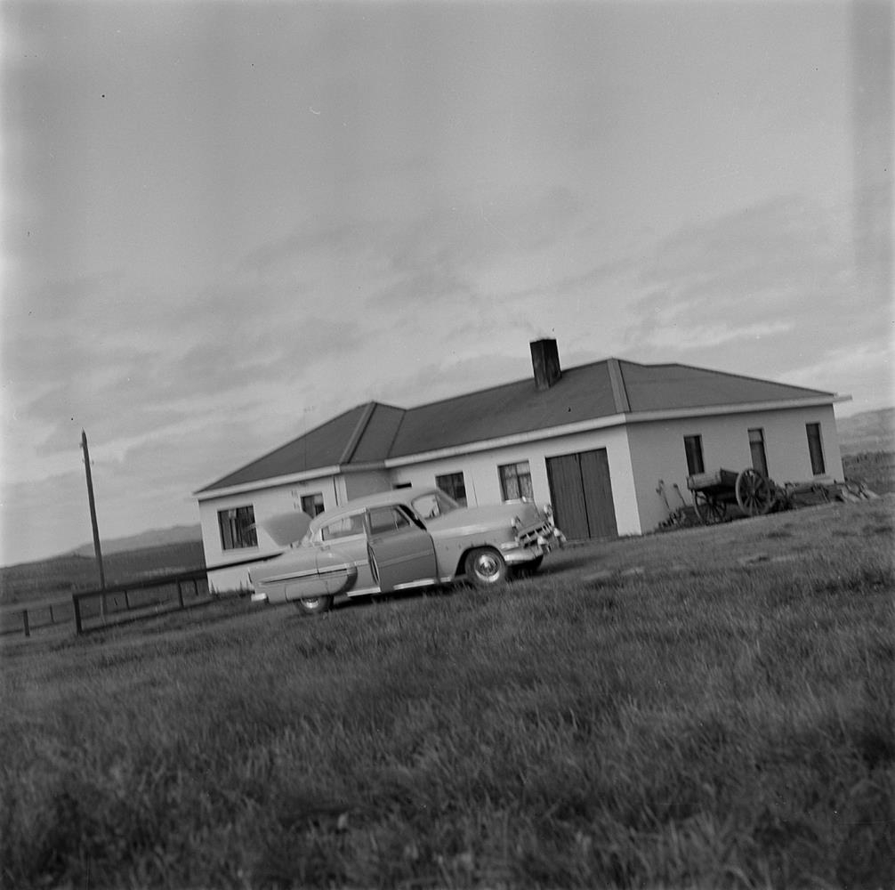 Íbúðarhús með valmaþaki. Bíll á veginum framan við húsið. Hestakerra við húsið