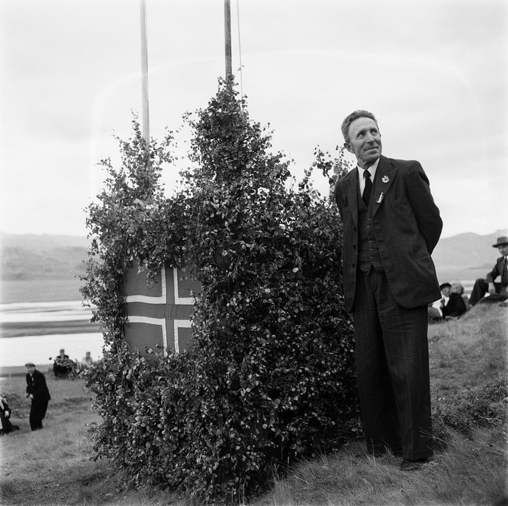 Maður í jakkafötum stendur hjá ræðupúlti sem skreytt er trjágreinum og með íslenska fánann að framanverðu.