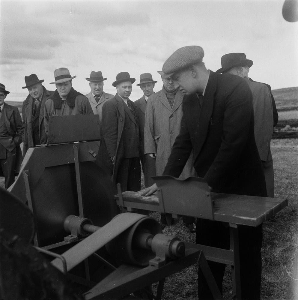 Maður að sýna vélsög sem fest er í dráttarvél saga. Hópur sparibúinna manna fylgist með. Mennirnir eru talið f.v.: óþekktur, Pétur Gunnarsson atvinnudeild, Þórhallur Halldórsson frá Hvanneyri, Jón Pálmason alþingismaður Akri, Harry Frederiksen, Ásgeir Jónsson starfsmaður í véladeild SÍS og Sigtryggur Klemensson