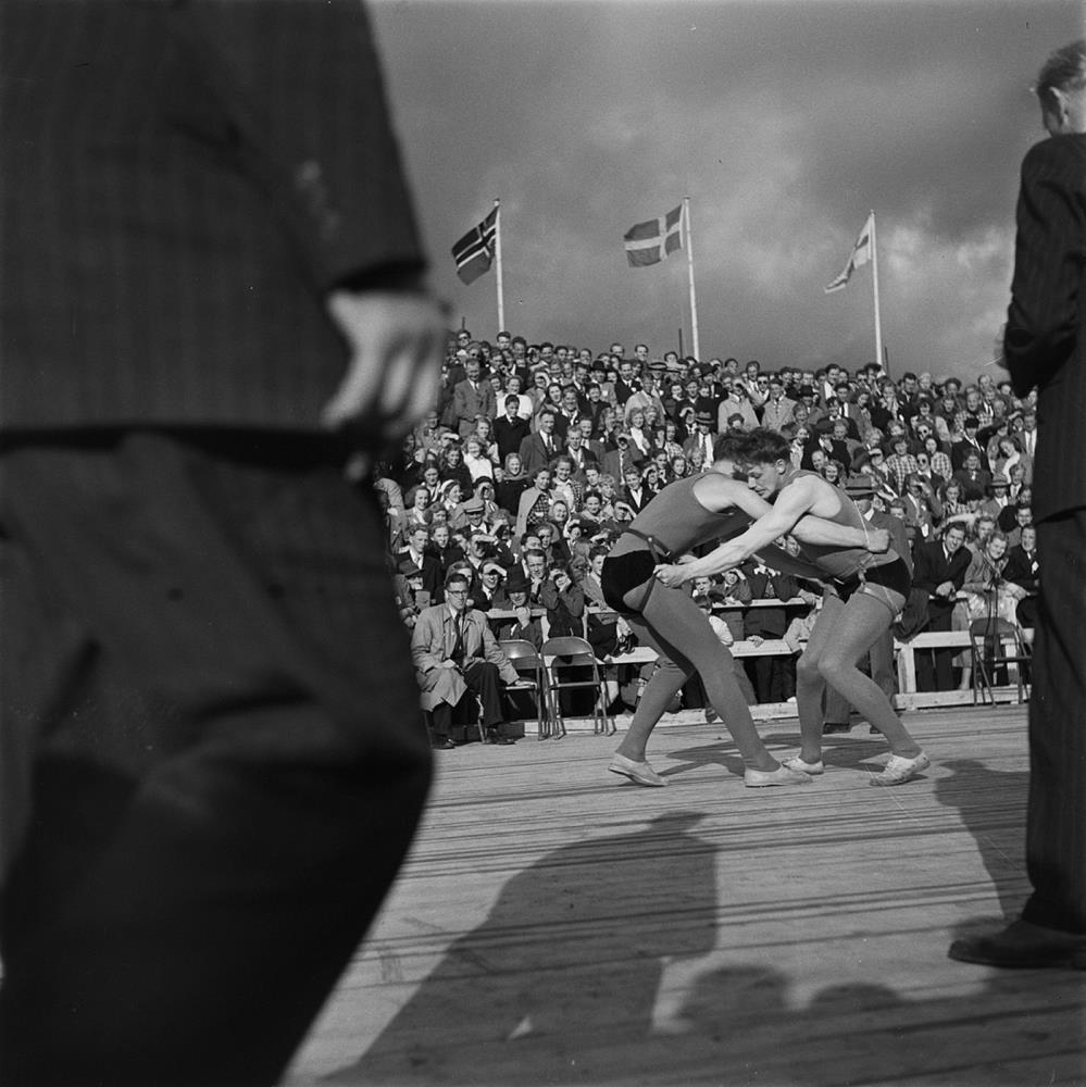 Tveir karlmenn að glíma á trépalli. Sér í dómara sem fylgjast með. Mannfjöldi í bakgrunni.