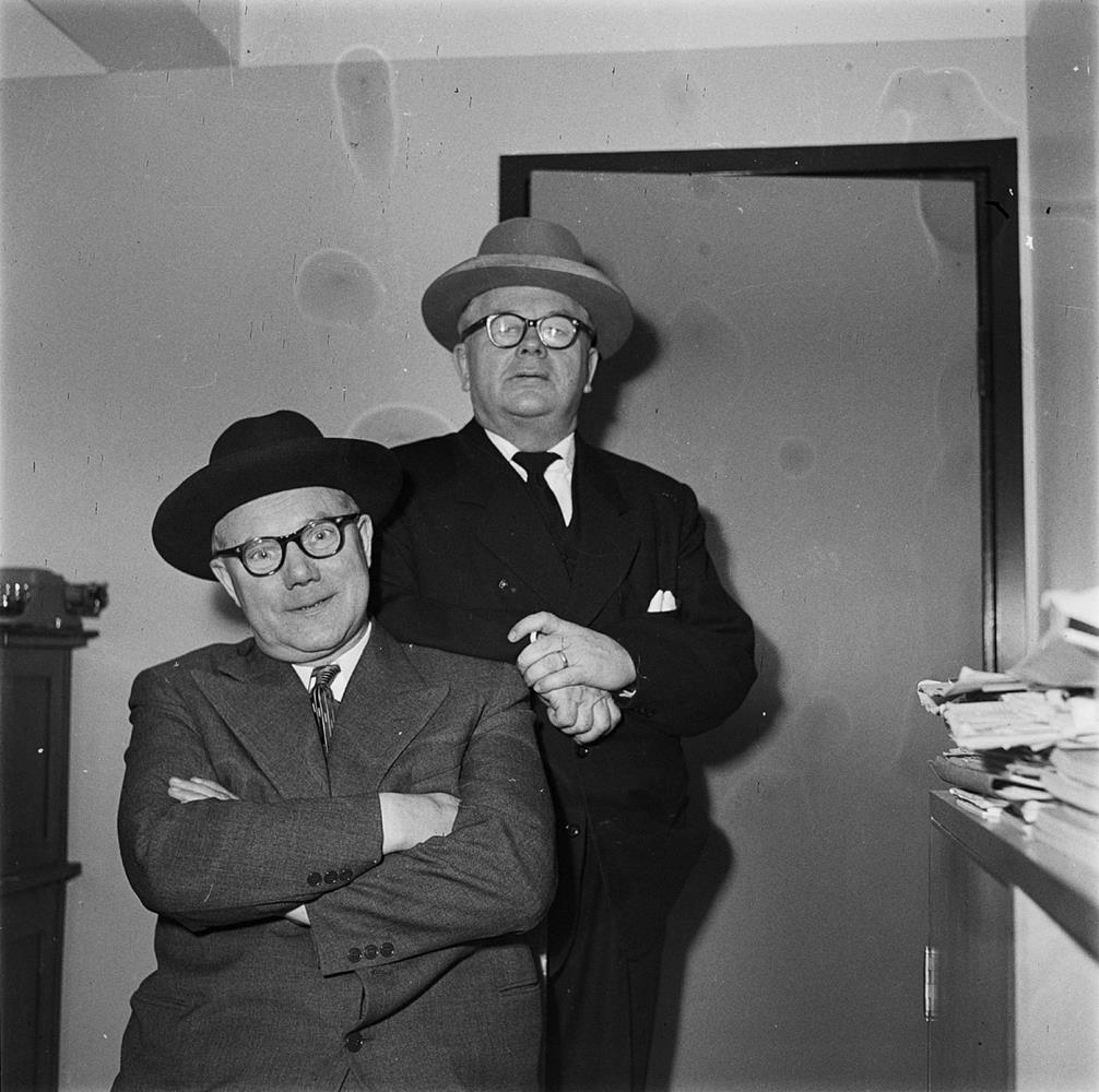 Tveir karlar í jakkafötum með hatta uppstilltir á skrifstofu. Mennirnir eru t.f.v.: Halldór Ásgrímsson og Karl Kristjánsson.
