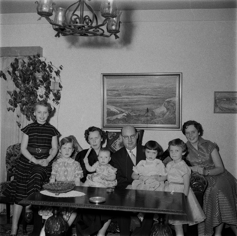 Fjölskylda situr á sófa í stofu. Hjón með sex dætur. Þær eru í aldursröð Rúna Bína, Anna Ingibjörg, Unnur, Jakobína, Jóhanna og Sigríður.