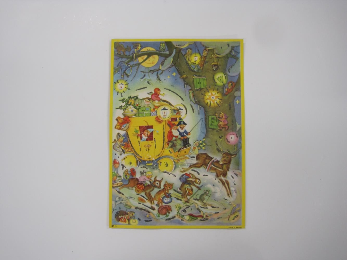 Jóladagatal með gluggum frá einum upp í 24. Skreytt með glimmer. Á bakhlið er skrifað "Anna". Sellófan er utan um dagatalið.