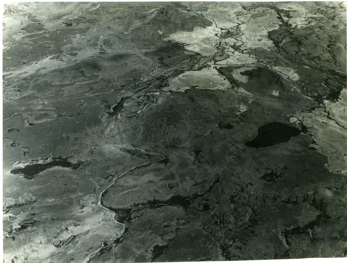 Loftmynd. Hálendið, snjór, fjöll, jöklar, ár og lækir.