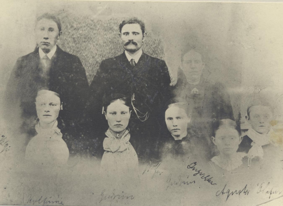 Heimilisfólkið í Norður-Hvammi í Mýrdal og Eyjólfur Guðmundsson á Hvoli. Efri röð:Helgi Dagbjartsson, Eyjólfur Guðmundsson, Ingveldur Guðmundsdóttir. Neðri röð: Kolfinna, Guðrún, Guðrún?, Ágústa og Ólafur.