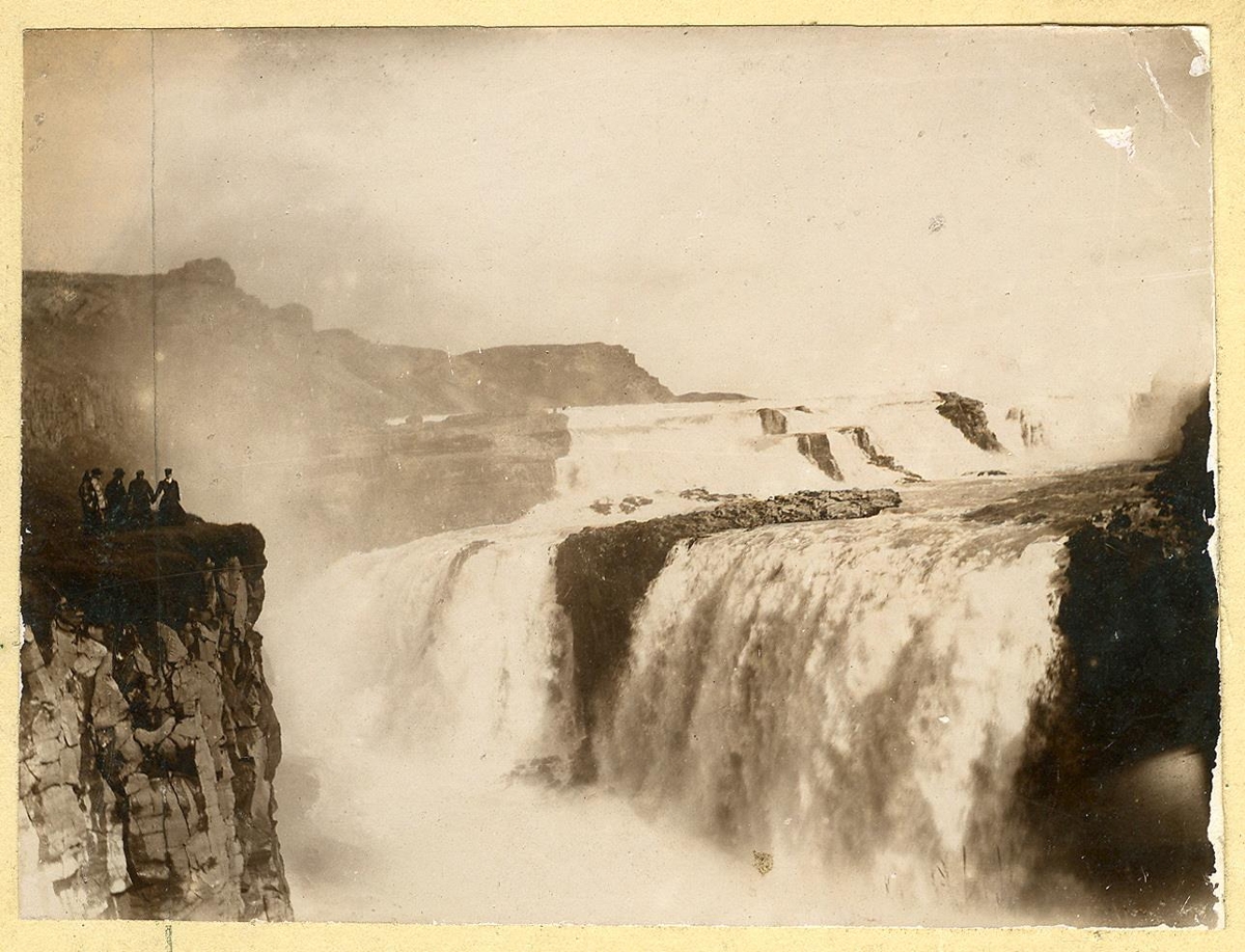 Foss sem fellur fram í nokkrum þrepum. Fólk stendur á kletti við hann.
