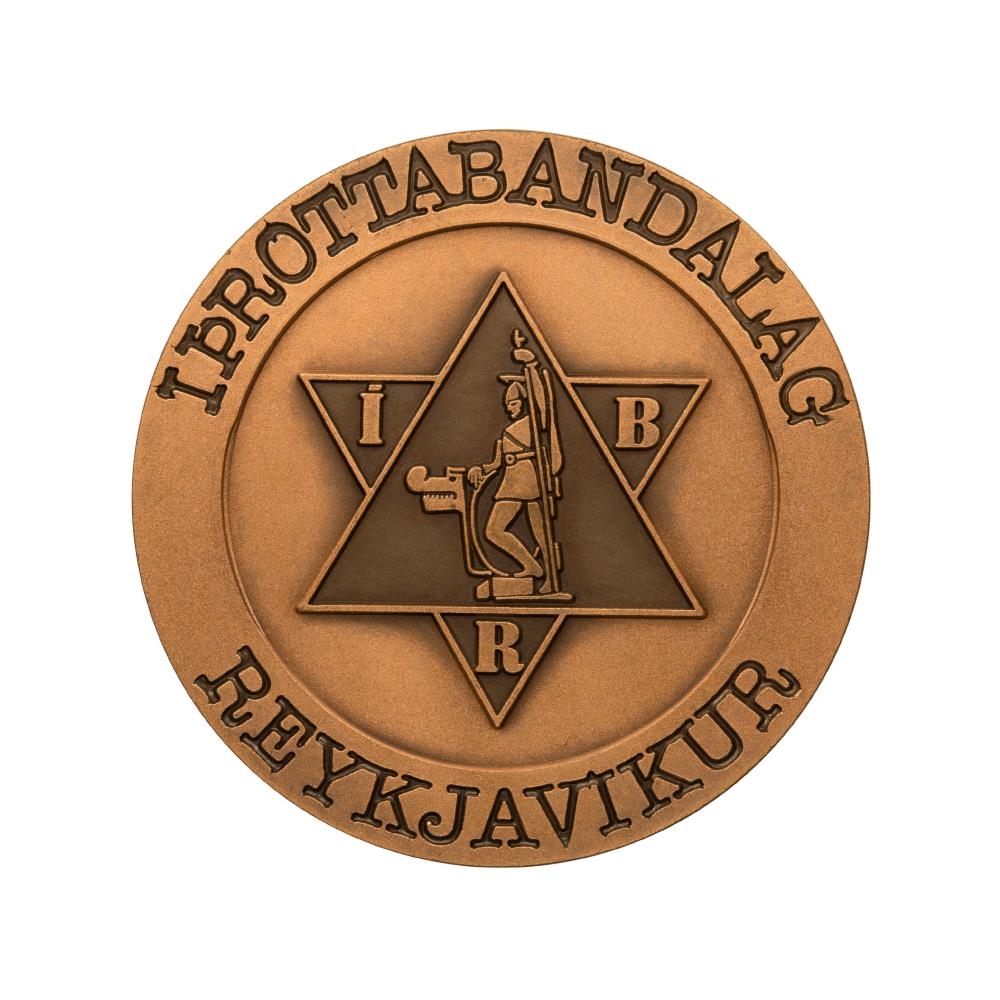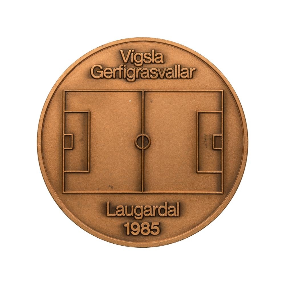 Þessi minnispeningur var búinn til Íþróttabandalagi Reykjavíkur í tilefni af opnun gerfigrasvallar í Laugardal.