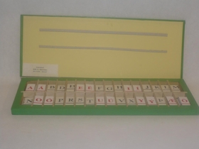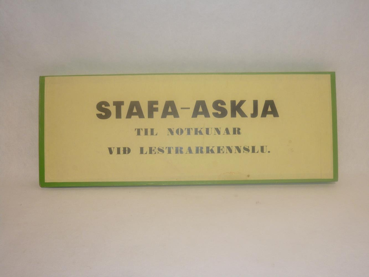 Stafaaskja til notkunar við lestrarkennslu. Græn og ljós að lit úr viði og pappa. Framleiðandi hennar var Njáll B. Bjarnason Akureyri, sími 21538.
