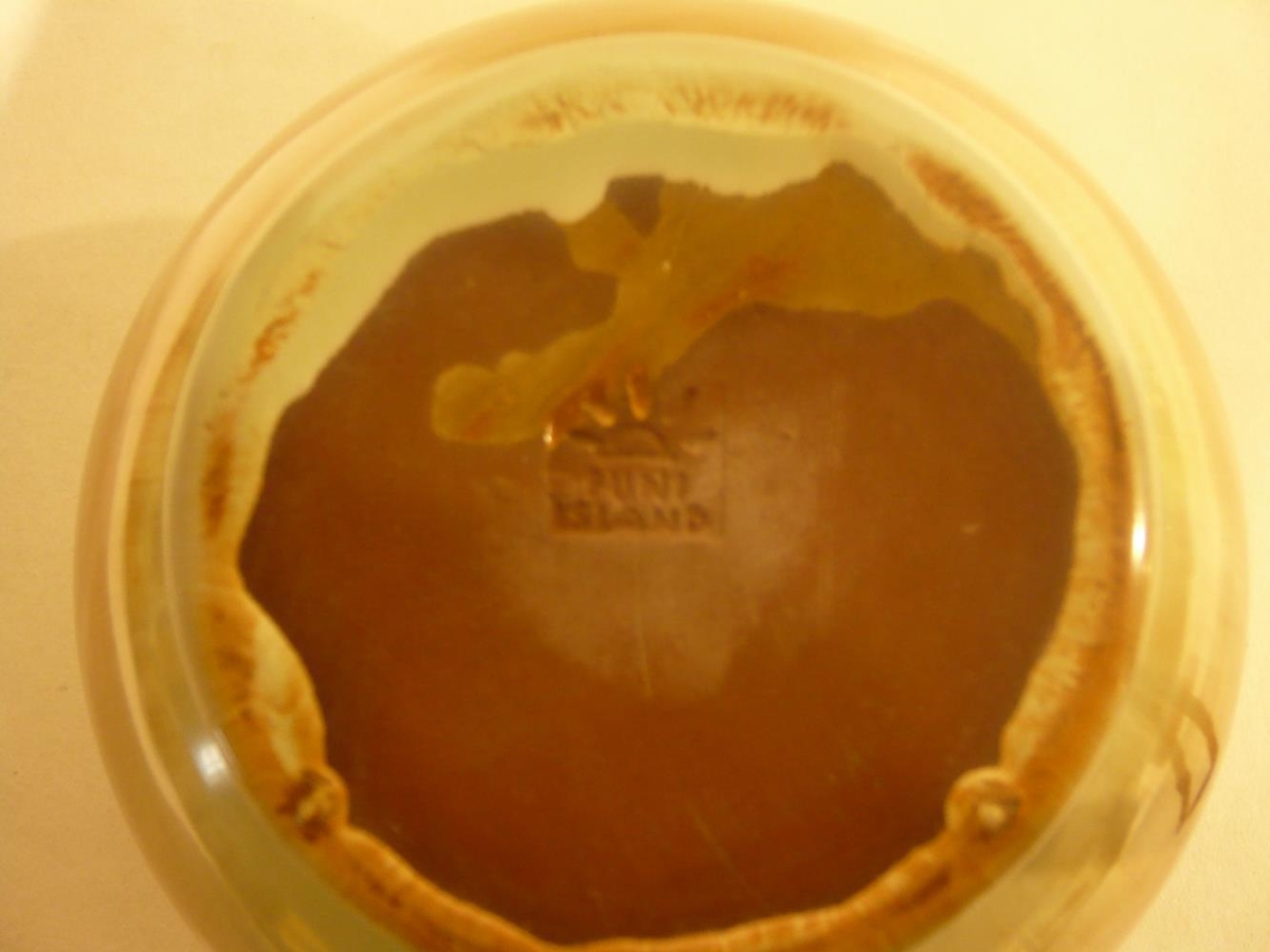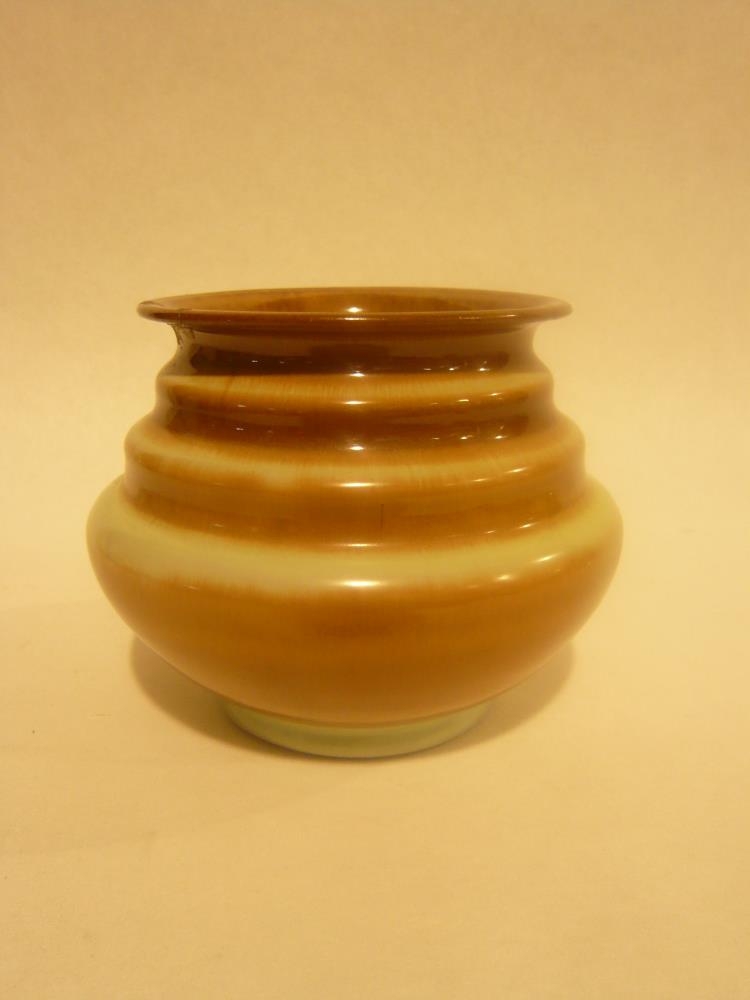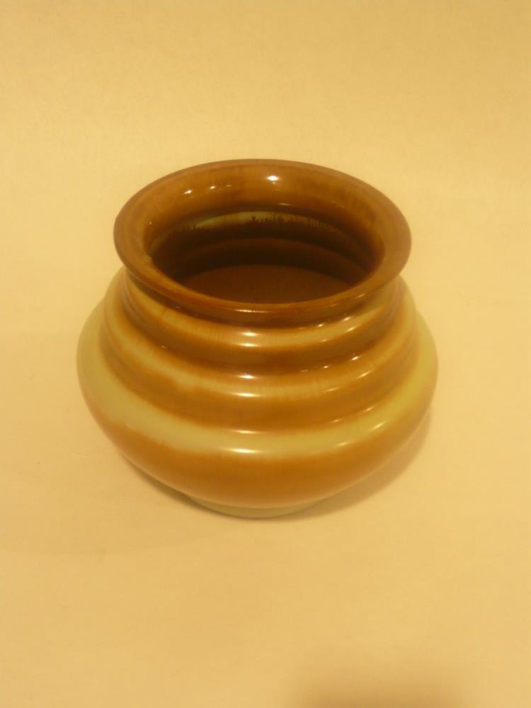 Brúnn og grænn vasi með röndum á. Vasinn hefur brotnað að ofan og verið límdur. Vasinn er framleiddur á Íslandi af Funa.