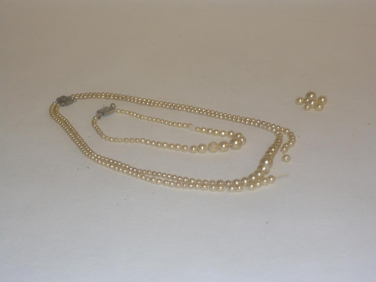 Perlufesti og armband með málmfestingum. Perlufestin er tvöföld og hún er slitin. Festin og armbandið hafa greinilega verið notuð töluvert og húðin á perlunum er farin að flagna af.