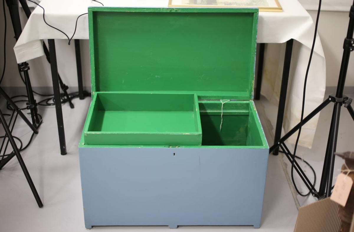Ljósblátt koffort, að utan en grænt að innan. Inni í því er laus kassi eða skrúfa (málin á því eru l. 32,5 b.35. h.9,5). Saga koffortsins er þessi; Guðlaug (Lauga) fædd 1930, dvaldi hjá móðursystur sinni í Mjóanesi Sigurbjörgu Pétursdóttur og manni hennar Stefáni Eyjólfssyni. Hann fékk Sigurð Guttormsson á Hallormsstað, sem fékkst nokkuð við að smíðar, til að smíða koffort þetta sem hann gaf Laugu til að varðveita eigur sínar í. Laugu þótti afar vænt um koffortið sem hefur fylgt henni allar götur síðan eða þar til hún fór á dvalarheimili.