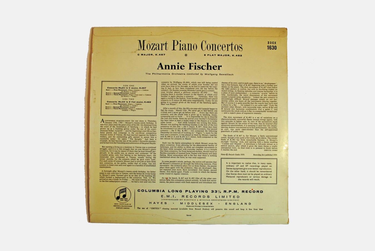 Annie Fischer píanóleikari ásamt The Philharmonia Orchestra undir stjórn Wolfgang Sawallisch flytja tvo píanókonserta eftir Mozart. Konsert í C-dúr K. 467 og Konsert í Es-dúr K. 482.