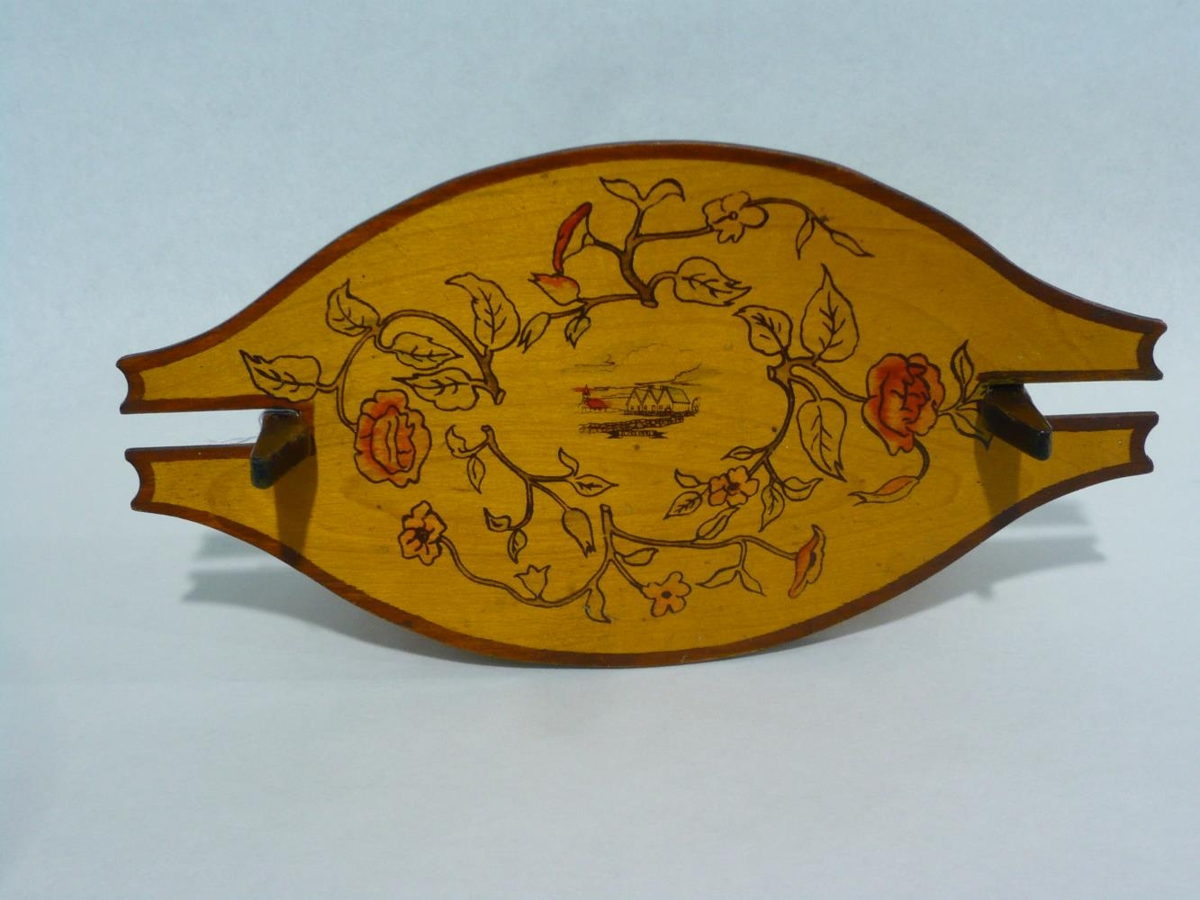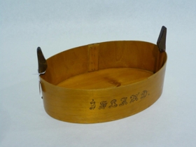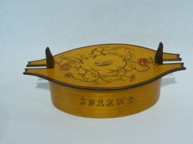 Sporöskjulaga askja með loki. Á annarri langhliðinni er málað Ísland. Á lokinu er máluð mynd af Þingvallabænum.