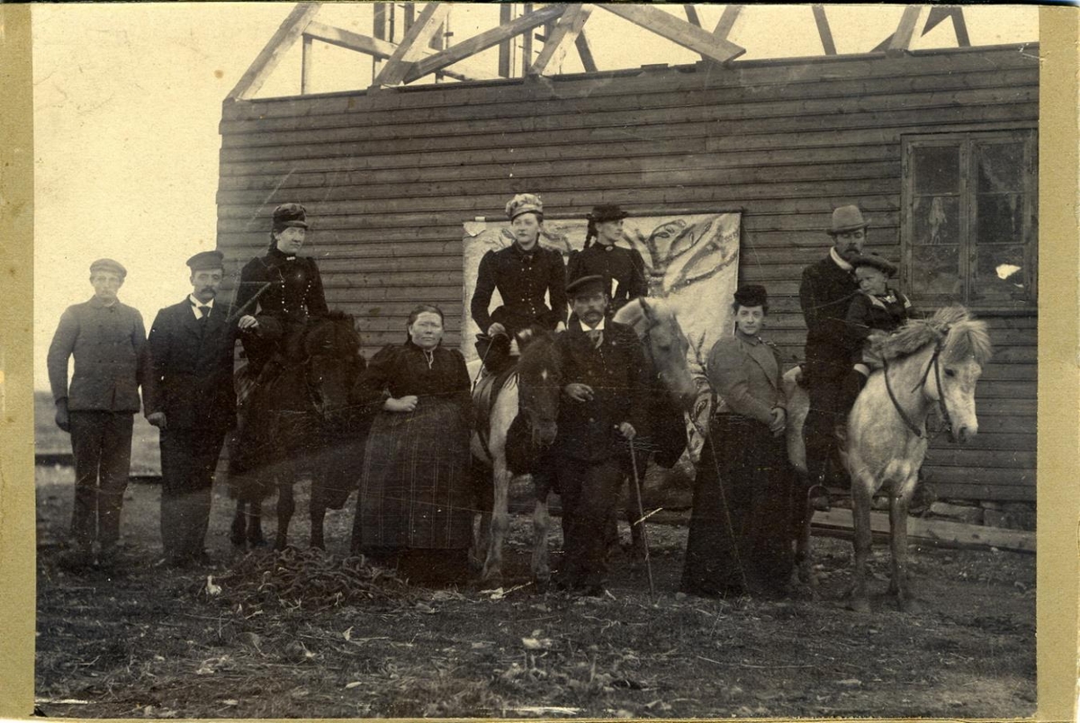 Hópur prúðbúins fólks framan við timburhús í byggingu. Þrjár konur sitja hesta sína í söðli og karlmaður er með dreng á hnakknefinu. Á vegg hússins er festur bakgrunnsdúkur fyrir ljósmyndatökur.