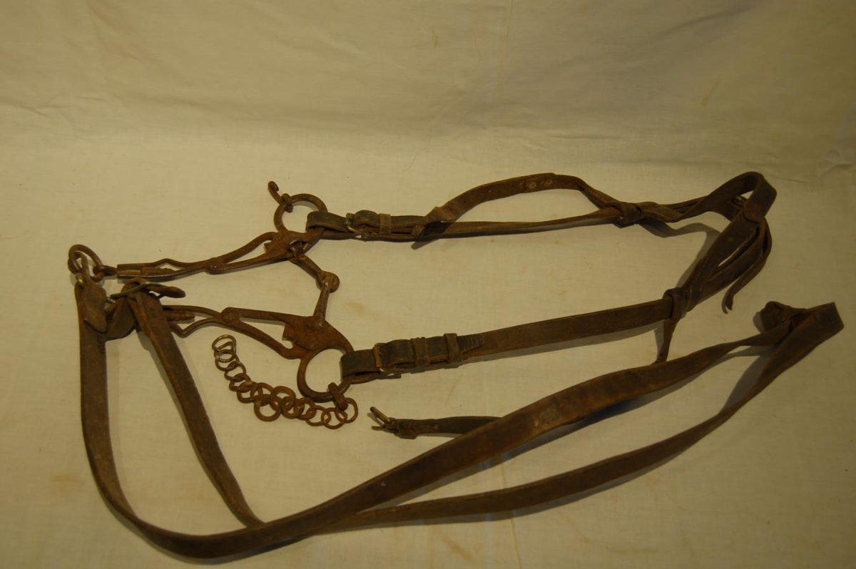 Reiðstangir með leðurtaum, aðeins ryð í stöngunum sjálfum en festingar nokkuð heilar.