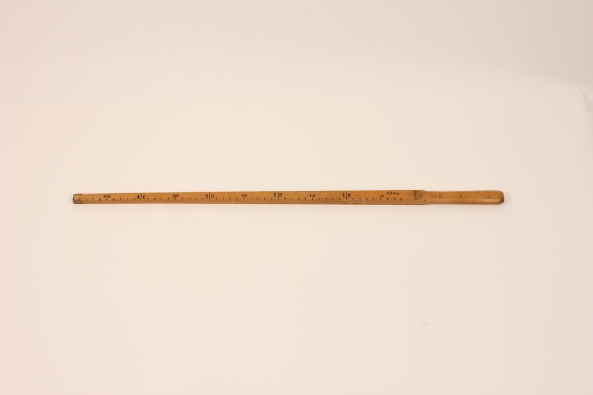 Mælistika, 50 cm. löng, úr tré. Notuð í vefnaðarvöruverslun. Ártalið 1944 stimplað á hana við skaftið.
