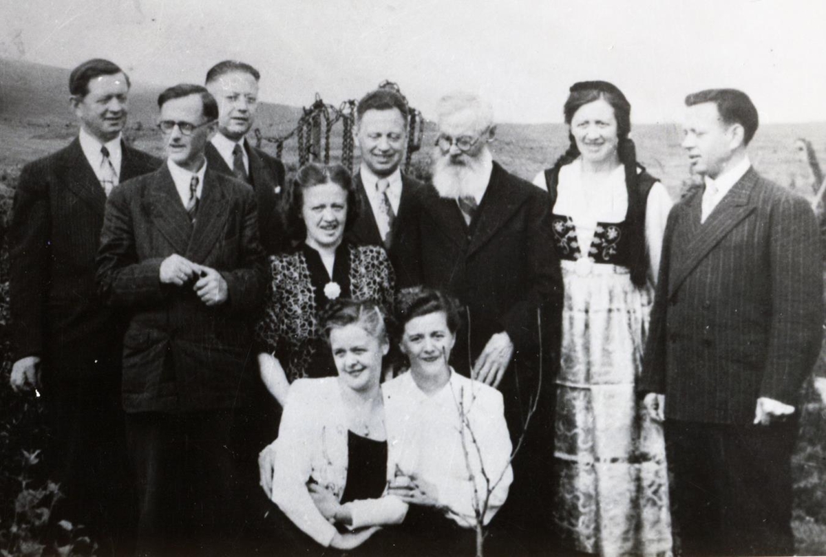 Þorgils Friðriksson frá Knarrarhöfn með börnum sínum, myndin er tekin á níræðisafmæli hans 12. ágúst 1950. Frá vinstri, standandi: Egill, Sigmundur, Þórhallur, Helga, Ari (Arinbjörn), Þorgils, Steinunn og Kjartan. Frá vinstri, sitjandi: Fríða og Sigríður.