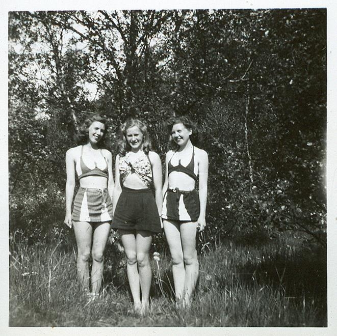 Þrjár ungar stúlkur klæddar í eins konar bikini, brjóstahöld og stutt pils í trjálundi.