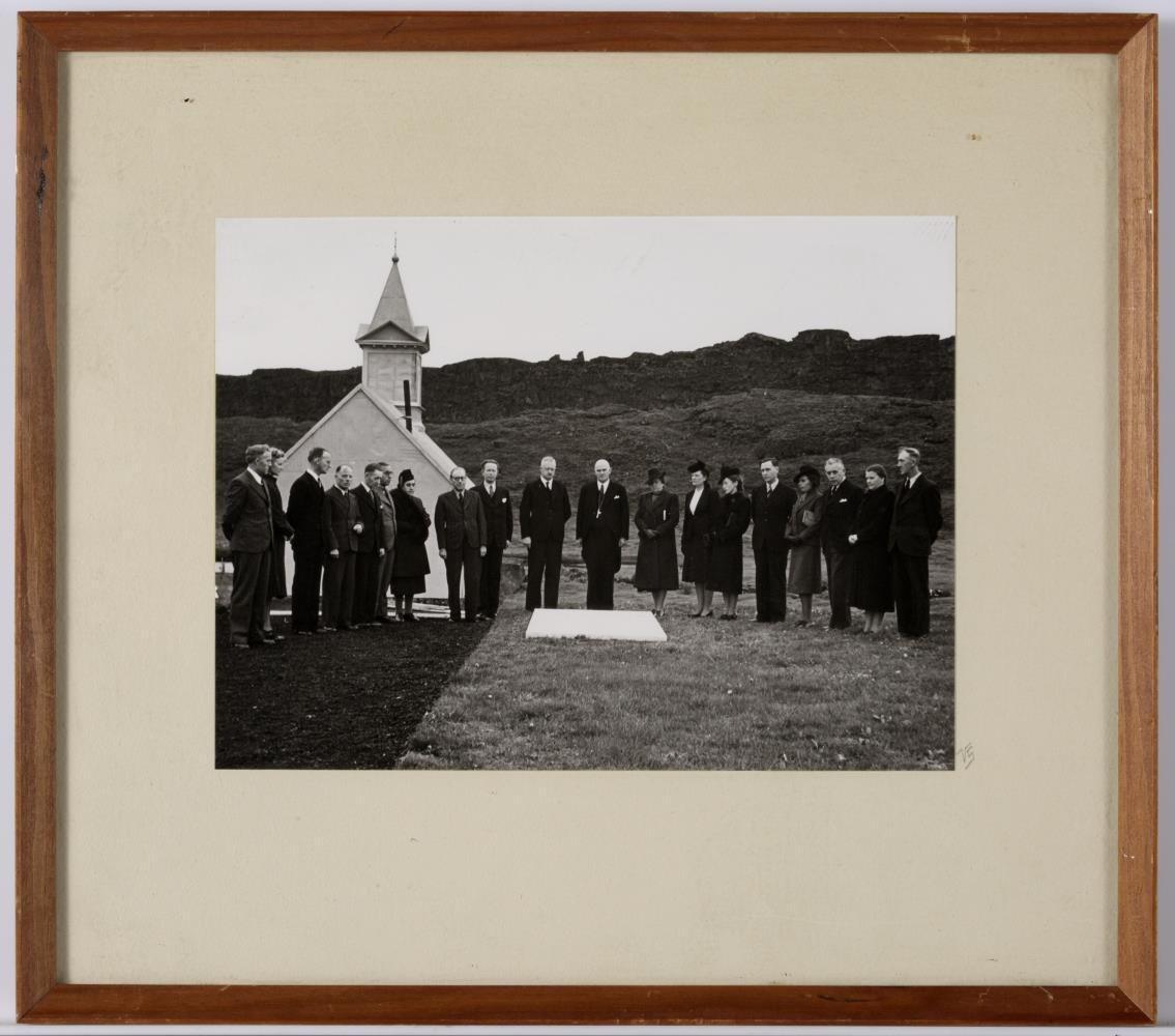 Innrömmuð mynd frá því að legsteinn var settur á leiði Jónasar Hallgrímssonar á Þingvöllum. Fólk stendur í hálfshring kringum leiðið. Frá vinstri er númer 6. Jónas Jónasson frá Hriflu, 7. Guðrún Stefánsdóttir kona hans, 9. Valgarð Thoroddsen, 10. séra Hálfdán Helgason Mosfelli, 11. séra Sigurgeir Sigurðsson biskup, 17. Haraldur Guðmundsson alþingismaður, 18. Elísabet Brand, 19. Thor Brand Þjóðgarðsvörður.