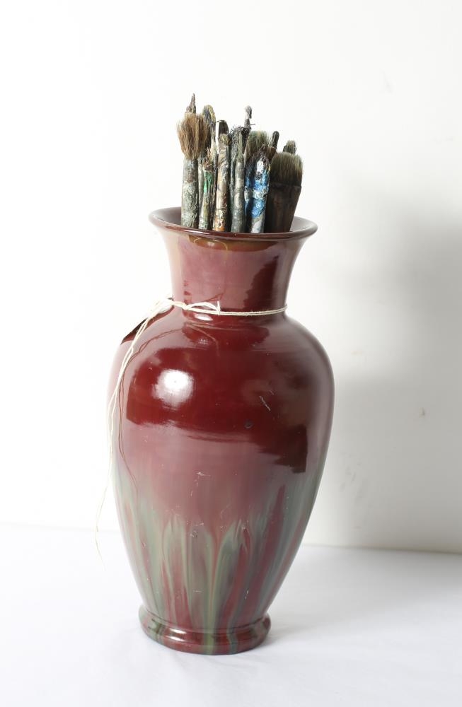 Blómavasi eftir Guðmund frá Miðdal. Rauðbrúnn og grænn. Vasann notaði Jóhannes Kjarval undir pensla og fylgja honum 35 penslar og ein pennastöng.