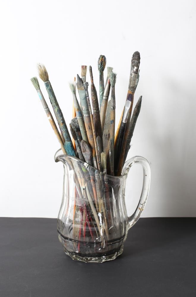 Glær glerkanna. Inniheldur 51 notaðan pensil. Allir af mismunandi gerðum og stærðum. Var í eigu Jóhannesar Sveinssonar Kjarval, listmálara.