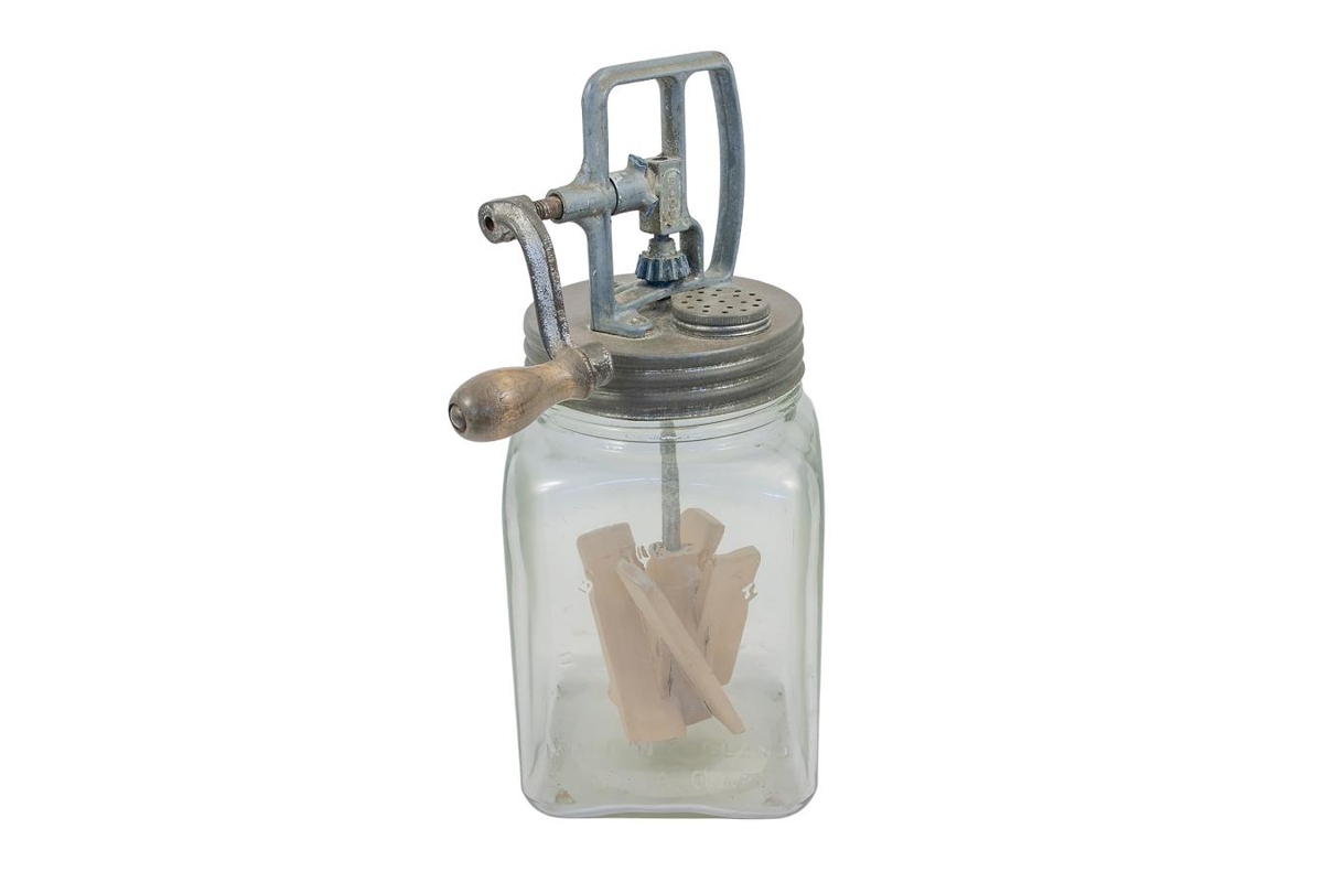 Strokkur ,lítill, geymirinn úr gleri, enskur. Úr búi Magnúsi Guðmundssonar ,útgerðamanns og skipstjóra á Traðarbakka, Akranesi (1891-1956) og konu hans Kristínar Ólafsdóttir ,húsfreyju (1889-1970). Dætur þeirra Guðrún (f.1924) ,Elín (f.1927) og Arnbjörg (f.1929) Magnúsdætur ,gáfu safninu í ágúst 1990.