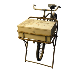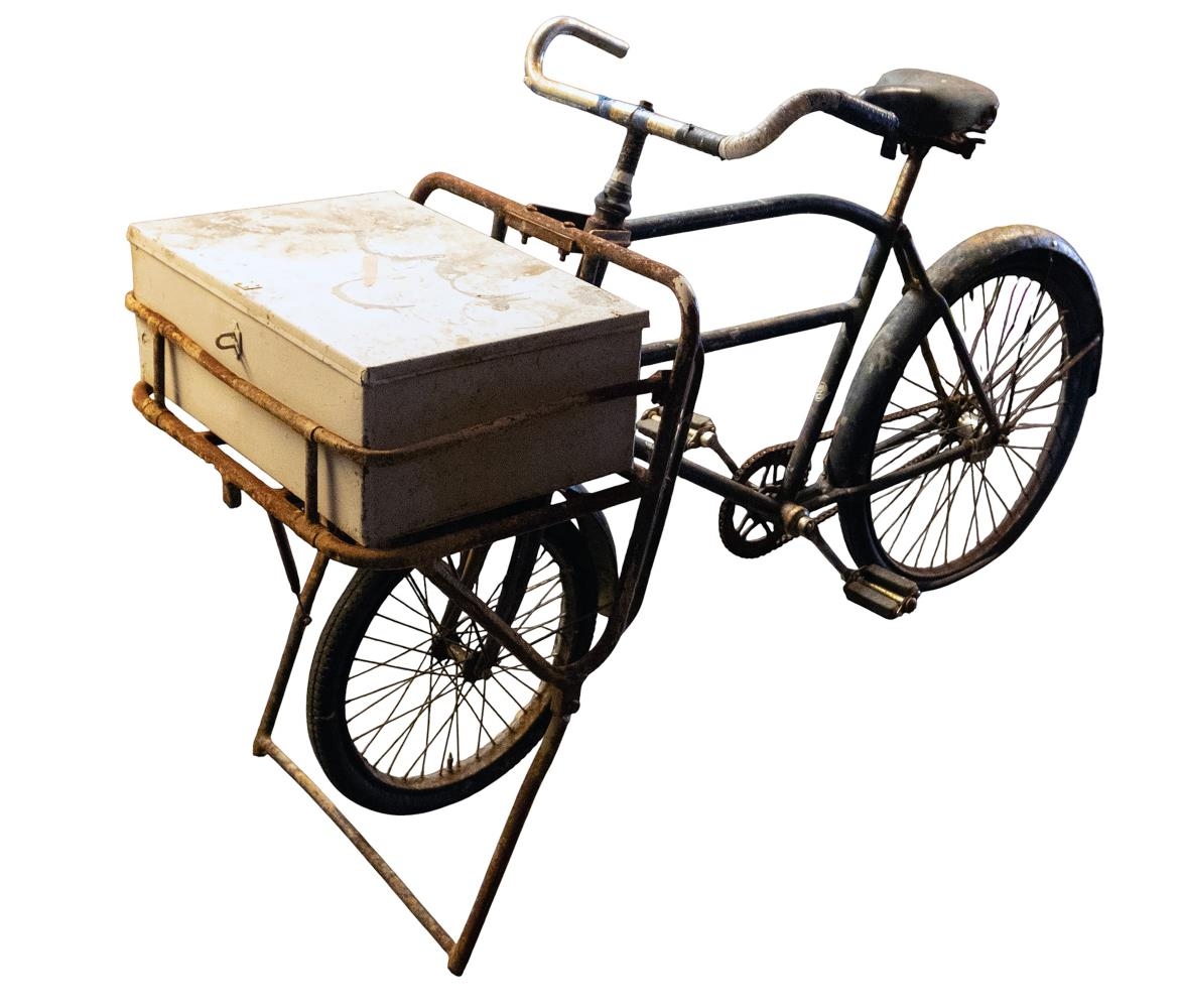Svart sendlingsreiðhjól sem grárri járnkistu.
