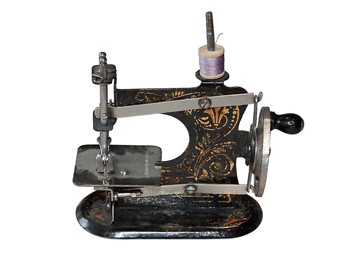 Leikfangsaumavél frá 1915-1920 og tvinnabox (með tvinnum og nálum í).Svava Finsen sem barn.Þýsk framleiðsla.