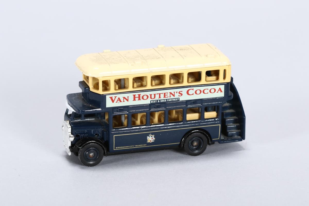 Dökk blár og kremhvítur tveggja hæða strætisvagn frá Birmingham city transport og með Van Houten's Cocoa auglýsingu