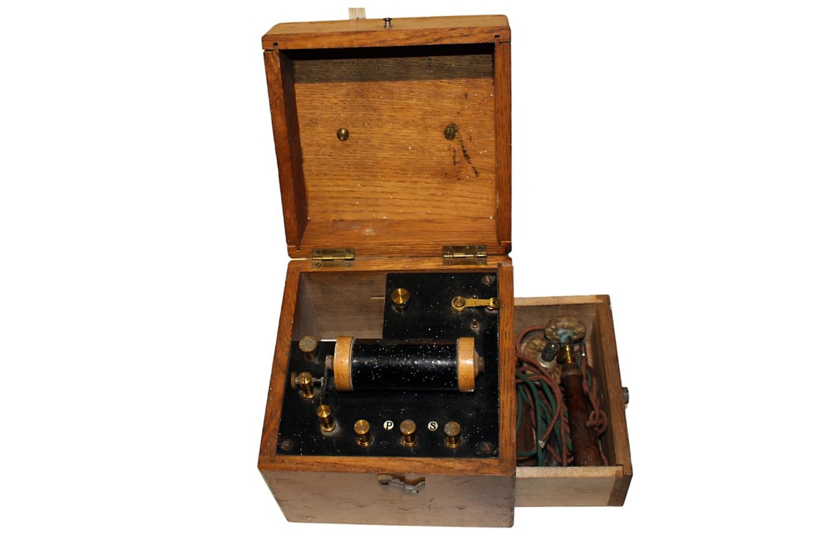 Lækningatæki / Gigtartæk í trékassa..Átti móðir gefanda.Tækið mun vera frá því um 1920 og var notað við handadofa.