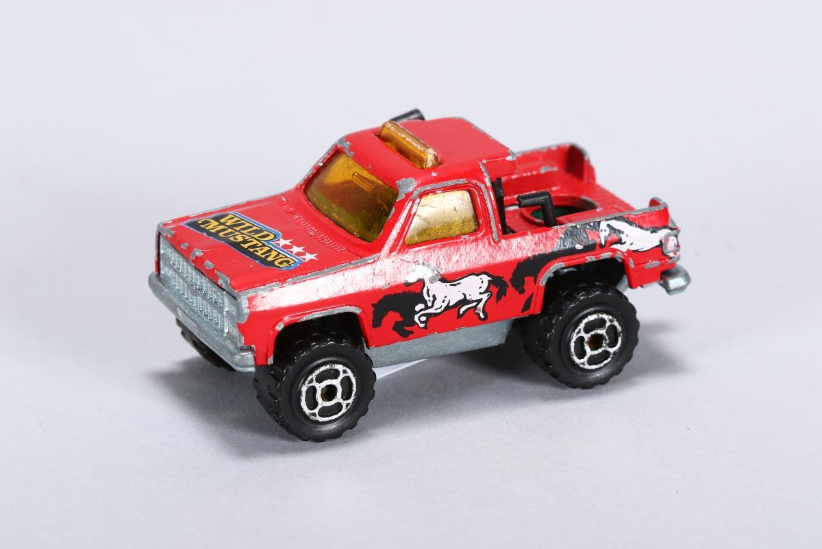 Rauður Chevrolet Pick up, merktur Wild Mustang og með myndir af hestum. Bíllinn er í hlutfalli 1:62