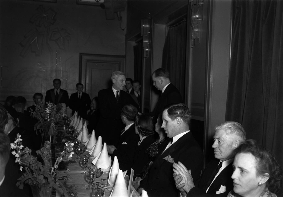 Hóf fyrir Brynjólf Bjarnason. Fólk situr við uppdekkað borð. Brynjólfur sjálfur stendur fyrir miðri mynd.