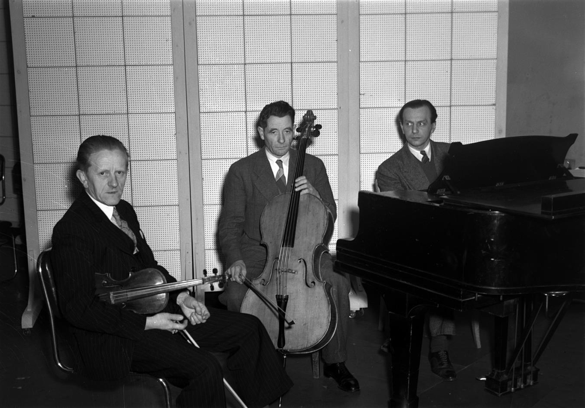 Þrír tónlistarmenn sitja við hljóðfæri sín. Til vinstri Þórarinn Guðmundsson fiðluleikari. Hljómlistarmenn fyrir Þjóðviljahátíðina.