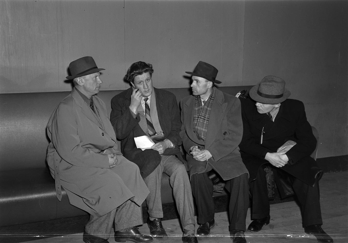 Fjórir karlmenn sitja á bólstruðum bekk. Allir klæddir frakka með hatt. Rússneskir vísindamenn frá friðarráðstefnu í New York