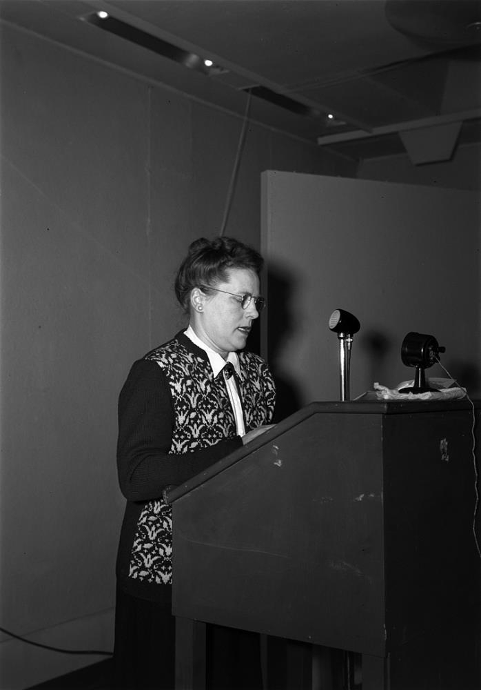Helga Rafnsdóttir heldur ræðu í púlti. Helga Rafnsdóttir formaður kvenfélags sósíalista