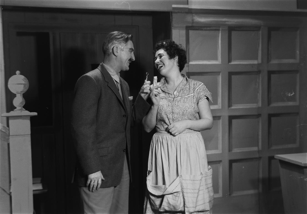 Maður og kona brosa til hvors annars uppi á sviði. Mynd úr leiksýningu leikfélags Hafnarfjarðar í Bæjarbíói, Gerviknapinn, 1958-1959. 1., 2. Steinunn Bjarnadóttir