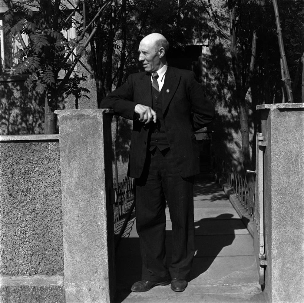Sigurður Guðnason, formaður Dagsbrúnar, stendur við garðshlið
