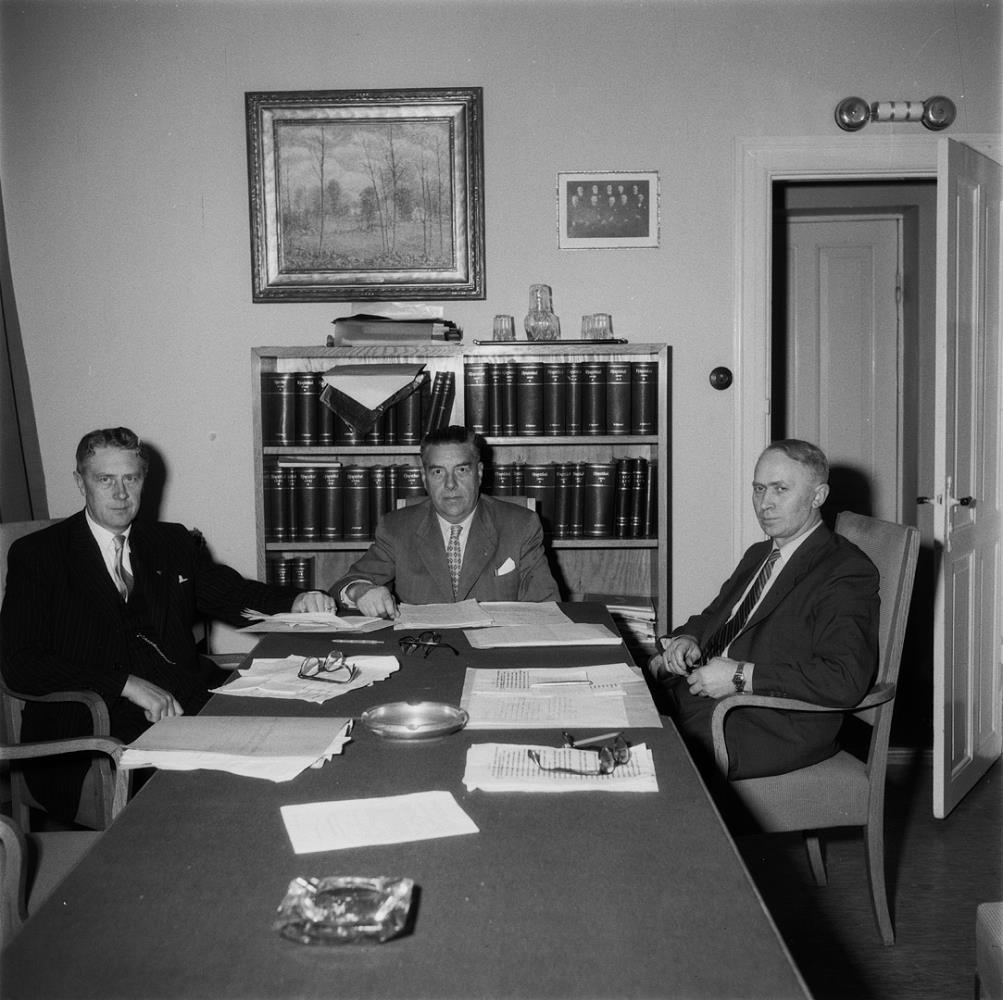 Þrír menn sitja við borð og Torfi Hjartarson situr í miðið við enda borðsins. Samninganefndir 1958. 1., 2. Torfi Hjartarson, 3.,
