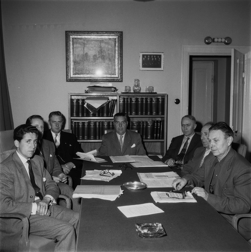 Samninganefnd situr við borð, Hjartarson situr í miðið við enda borðsins. Samninganefndir 1958.