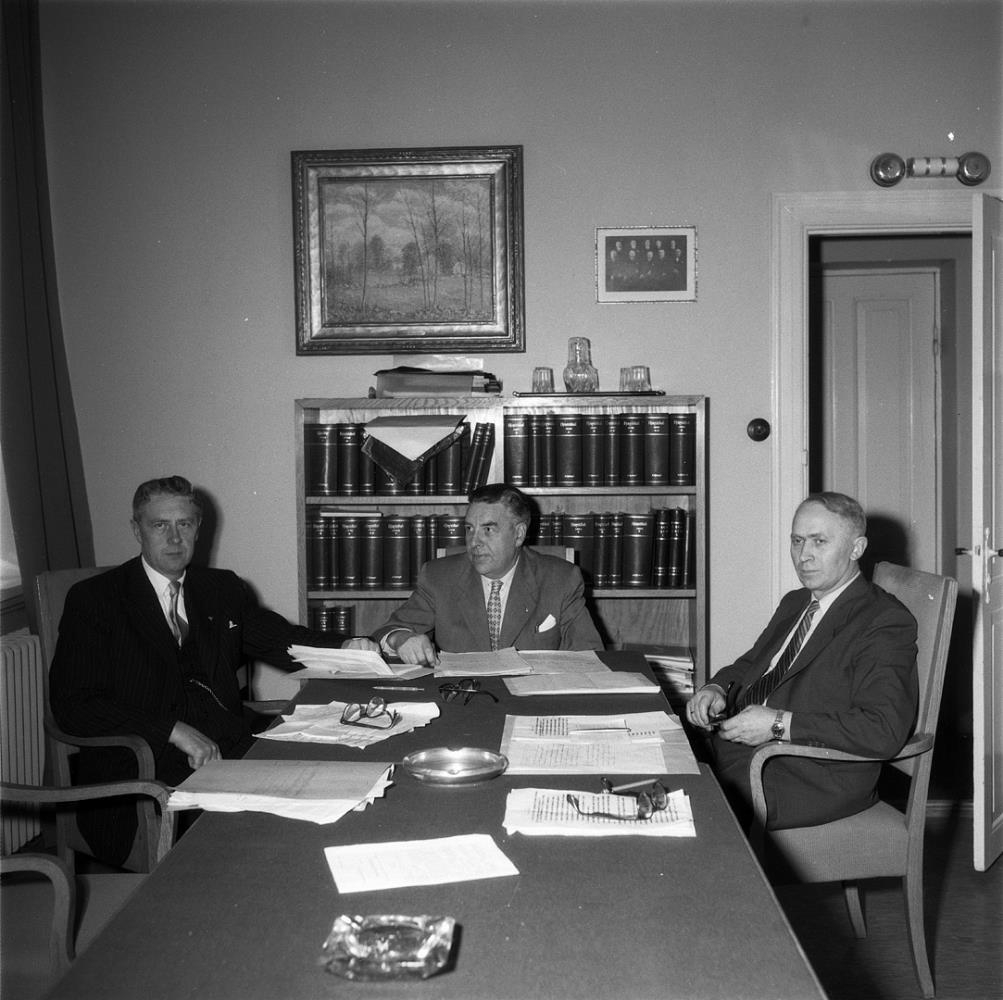 Þrír menn sitja við langt borð. Torfi Sigurhjartarson við enda borðsins. Samninganefndir 1958. 1., 2. Torfi Sigurhjartarson, 3.,