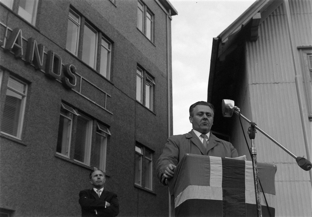 Maður að halda ræðu við púlt sem er umvafið íslenska fánanum. Útvegsbanki Íslands í bakgrunni. Gils Guðmundsson í ræðustól. hannibal Valdimarsson stendur aftan við hann.