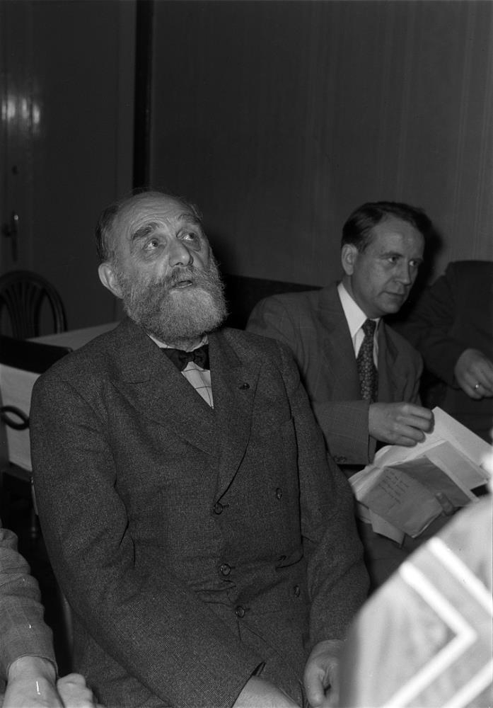 Peter Frauchen situr og horfir upp í loftið. Maður í bakgrunni