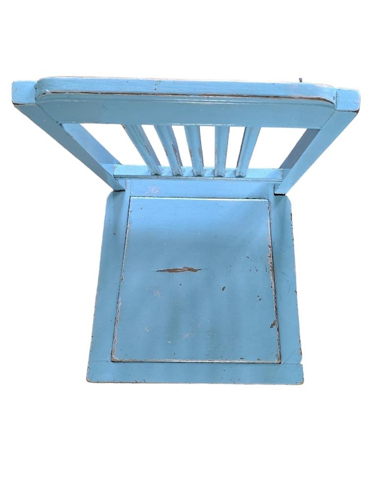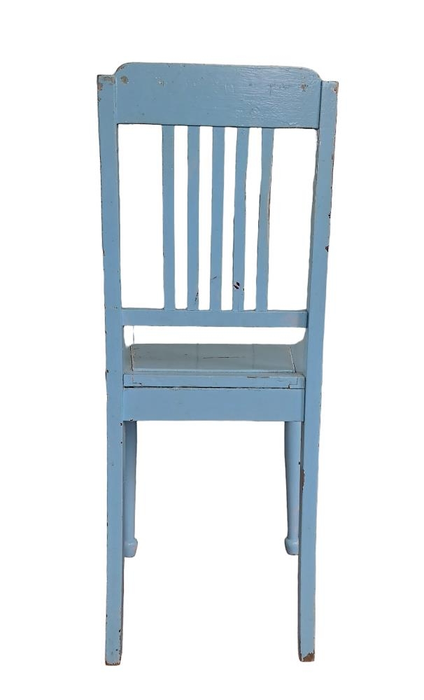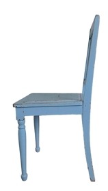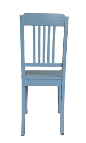 Stóll-borðstofustóll með fimm sléttum pinnum í baki og renndum framfótum ljósblámálaður ,krossviðsseta hefur áður verið bólstruð.Gef.Soffía G.Þórðardóttir ljósmóðir Grenigrund 35