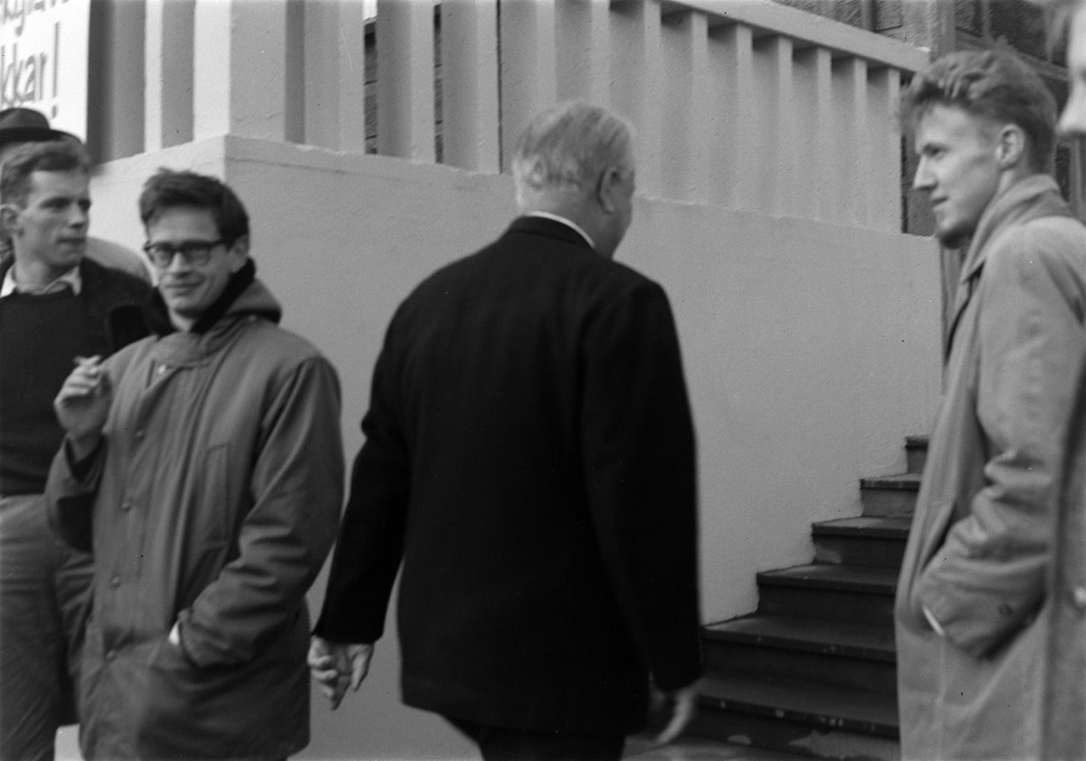 Maður gengur í átt að steintröppum framhjá nokkrum karlmönnum. Jón frá Pálmholti er með sígarettu. Her og landhelgismótmælaganga 1960.