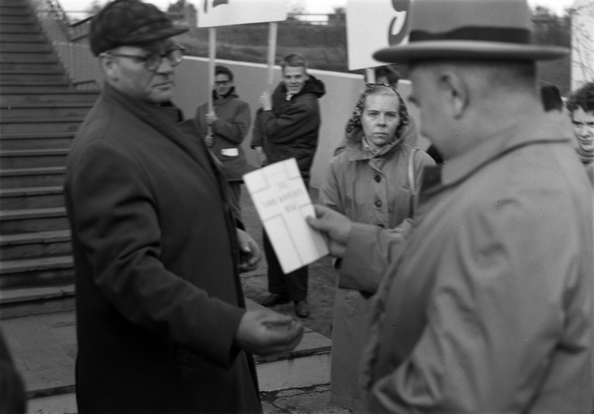 Maður með hatt og gleraugu réttir öðrum manni pappír. Fólk með mótmælaspjöld í bakgrunni. Jón og Dagur halda á skilti. Sér í Þuríði lengst t.h. Her og landhelgismótmælaganga 1960.