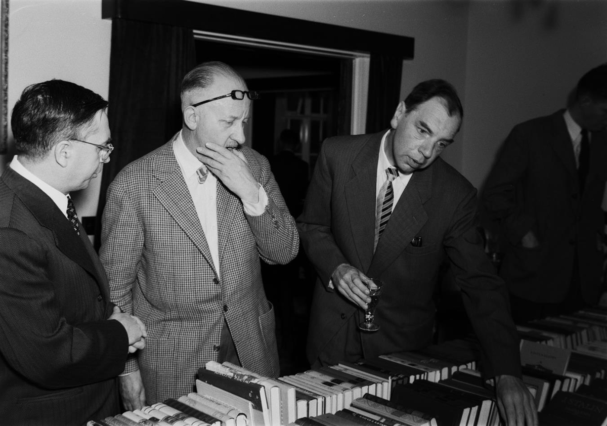 Halldór Laxness stendur við borð fullt af bókum og heldur um munn sér með gleraugun uppi á enninu. Í kring um hann standa tveir karlmenn og annar þeirra heldur á glasi. Rússneska sendiráðið. Bókagjöf 1955.