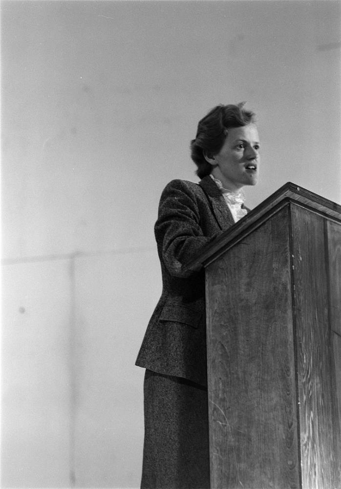 Adda Bára Sigfúsdóttir heldur ræðu við púlt uppi á sviði Austurbæjarbíós. Fundur Alþýðubandalags í Austurbæjarbíó 1956